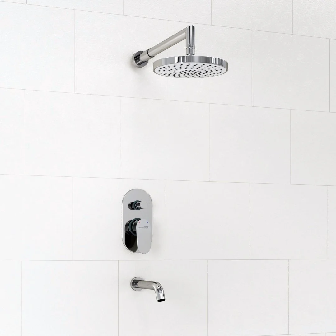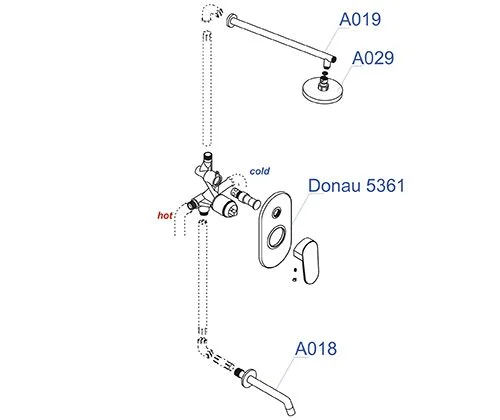 Смеситель для ванны и душа Donau 5361, Верхняя душевая насадка A029, Верхний излив для душа A019, Настенный излив для ванны A018