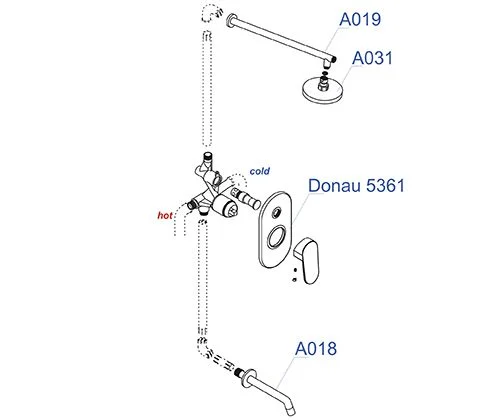 Смеситель для ванны и душа Donau 5361, Верхняя душевая насадка A031, Верхний излив для душа A019, Настенный излив для ванны A018