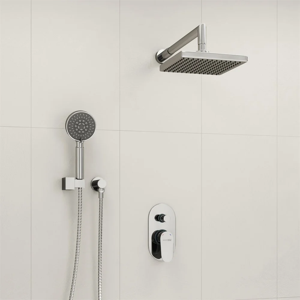 Керамический картридж 40мм, Sedal (Испания), Душевая насадка черная 200х200 мм, 144 форсунки, ABS-пластик, Лейка 5-функциональная с системой защиты от известковых отложений, Кнопочный переключатель на душ, Комплект скрытого монтажа, Наружная часть смесителя