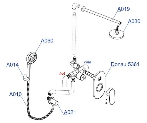 Смеситель для ванны и душа Donau 5361, Подключение шланга A021, Верхняя душевая насадка A030, Верхний излив для душа A019, Лейка 3-функциональная A060, Настенный держатель лейки, поворотный А014, Шланг для душа 1500 мм A010