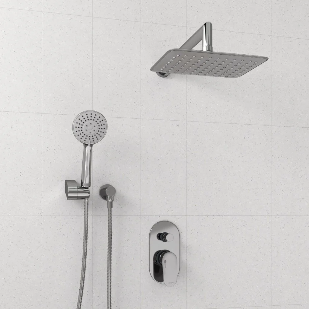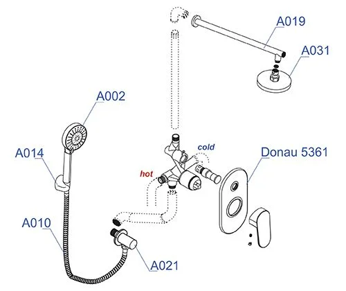 Смеситель для ванны и душа Donau 5361, Подключение шланга A021, Верхняя душевая насадка A031, Верхний излив для душа A019, Лейка 3-функциональная A002, Настенный держатель лейки, поворотный А014, Шланг для душа 1500 мм A010
