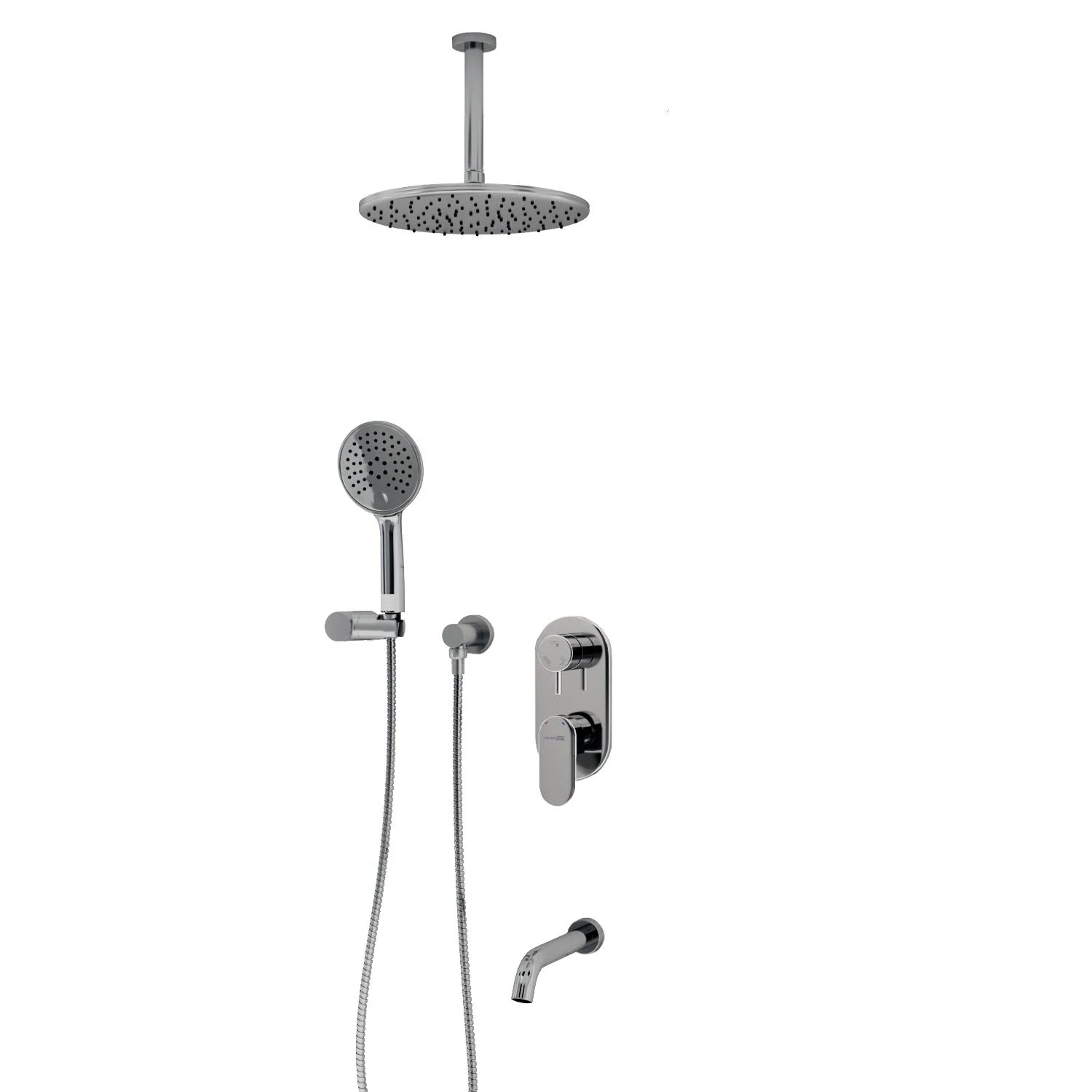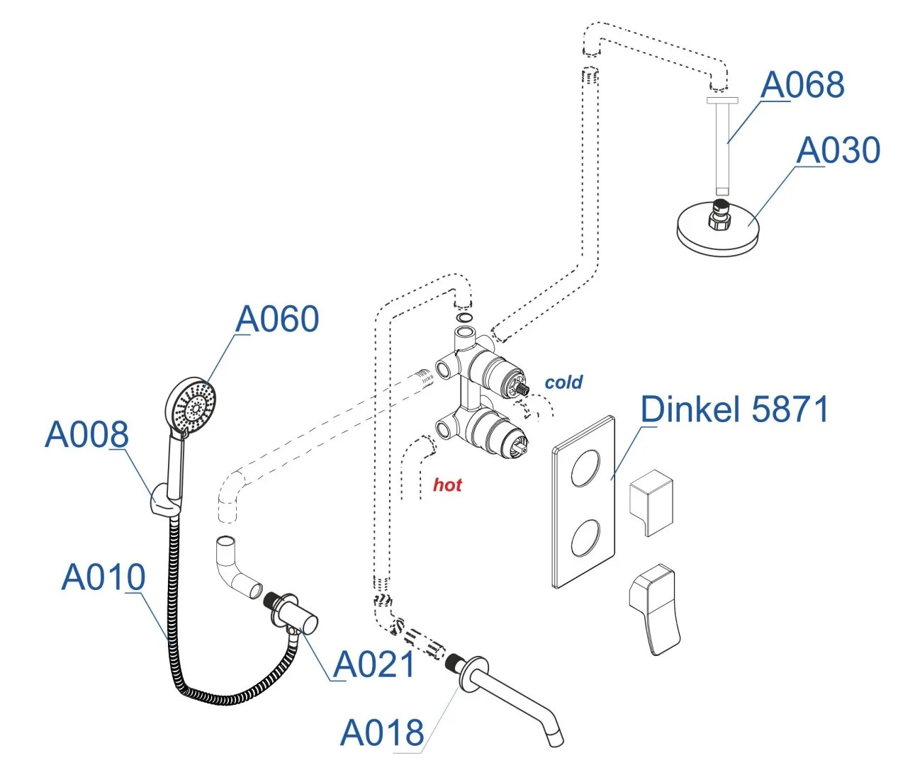 Смеситель для ванны и душа Dinkel 5871, Подключение шланга A021, Верхняя душевая насадка A030, Потолочный излив для душа A068, Лейка 3-функциональная A060, Настенный держатель лейки, поворотный А008, Шланг для душа 1500 мм A010, Настенный излив для ванны A018
