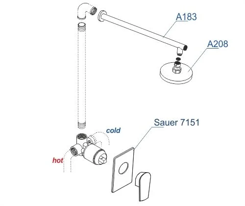 Смеситель для душа Sauer 7151, Верхняя душевая насадка A208, Настенный верхний излив для душа A183