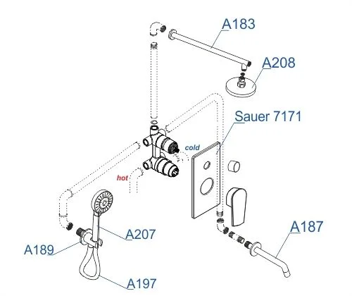 Смеситель для ванны и душа Sauer 7171, Подключение шланга A189, Шланг для душа 1500 мм A197, Верхняя душевая насадка A208, Настенный верхний излив для душа A183, Лейка 3-функциональная A207, Настенный излив для ванны A187