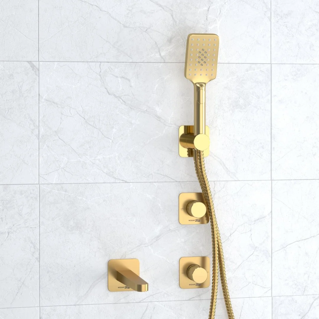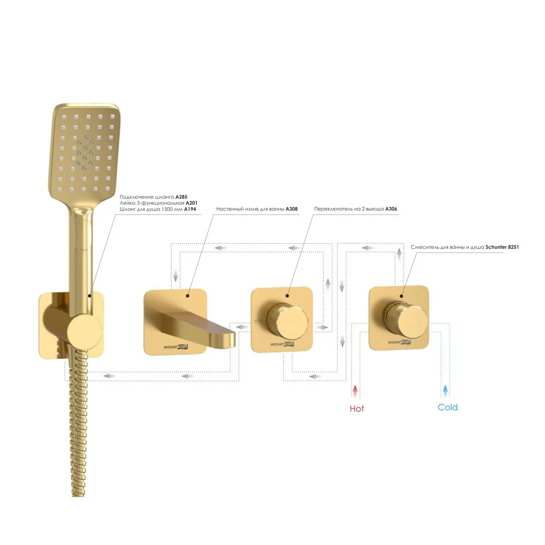 Смеситель для ванны и душа Schunter 8251, Переключатель на 2 выхода А306, Подключение шланга A285, Лейка 3-функциональная A201, Шланг для душа 1500 мм A194, Настенный излив для ванны A308