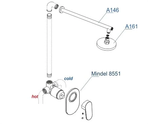 Смеситель для душа Mindel 8551, Верхняя душевая насадка A161, Настенный верхний излив для душа A146