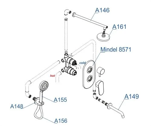 Смеситель для ванны и душа Mindel 8571, Подключение шланга A148, Шланг для душа 1500 мм A156, Верхняя душевая насадка A161, Настенный верхний излив для душа A146, Лейка 3-функциональная A155, Настенный излив для ванны A149