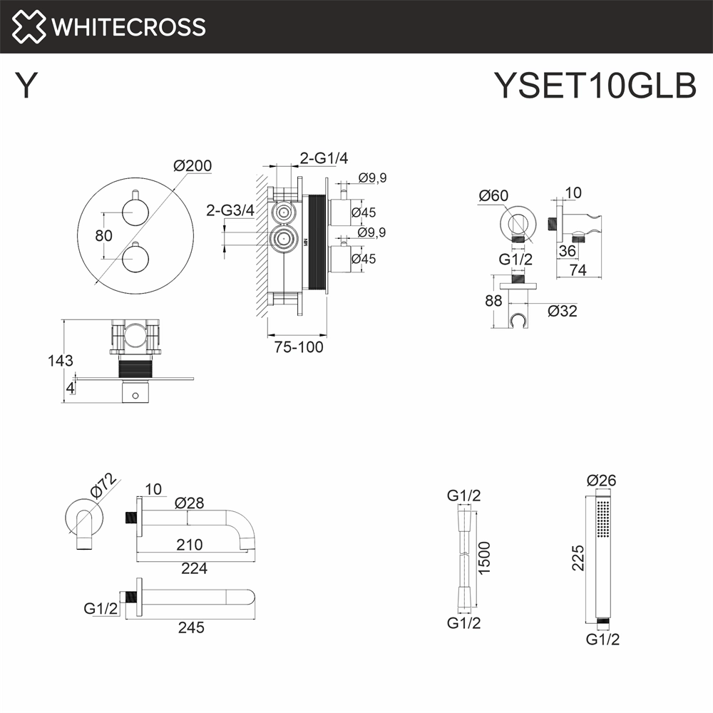 Смеситель для ванны WHITECROSS Y YSET10GLB (брашированное золото) с ручным душем, термостатический, скрытого монтажа