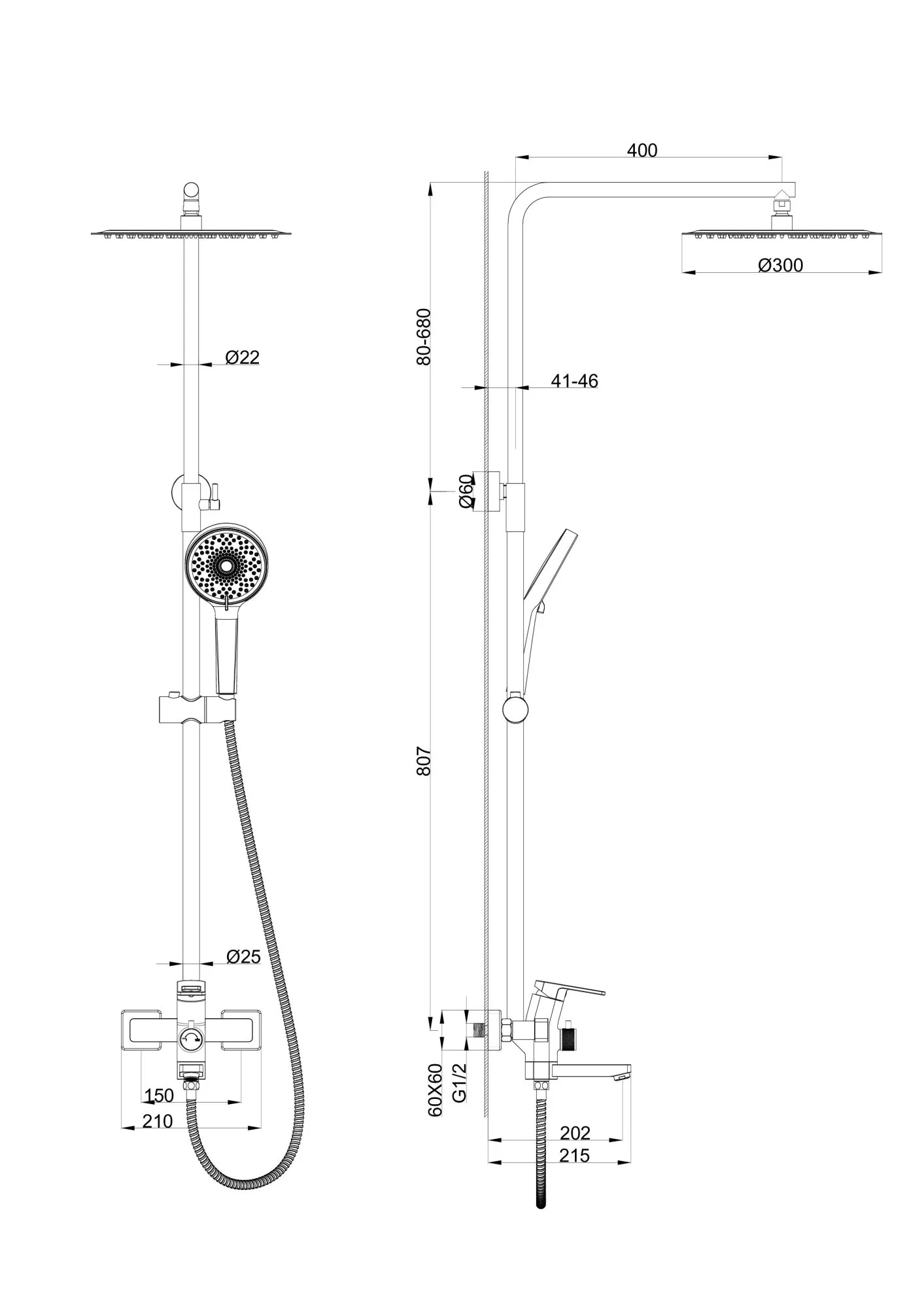 смеситель, душевой шланг/ держатель для душа, душевая штанга, верхний душ, душевая лейка, эксцентрики, монтажный комплект