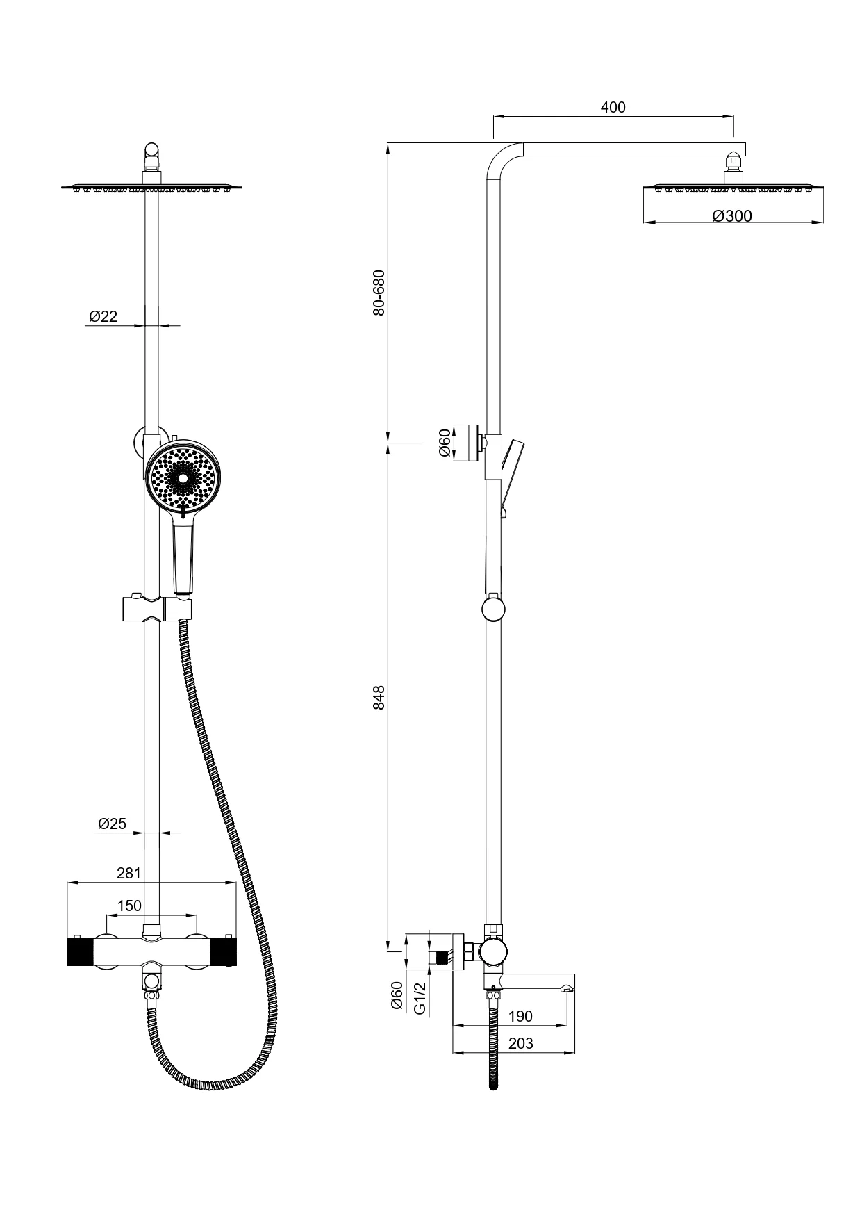смеситель, душевой шланг/ держатель для душа, душевая штанга, верхний душ, душевая лейка, эксцентрики, монтажный комплект