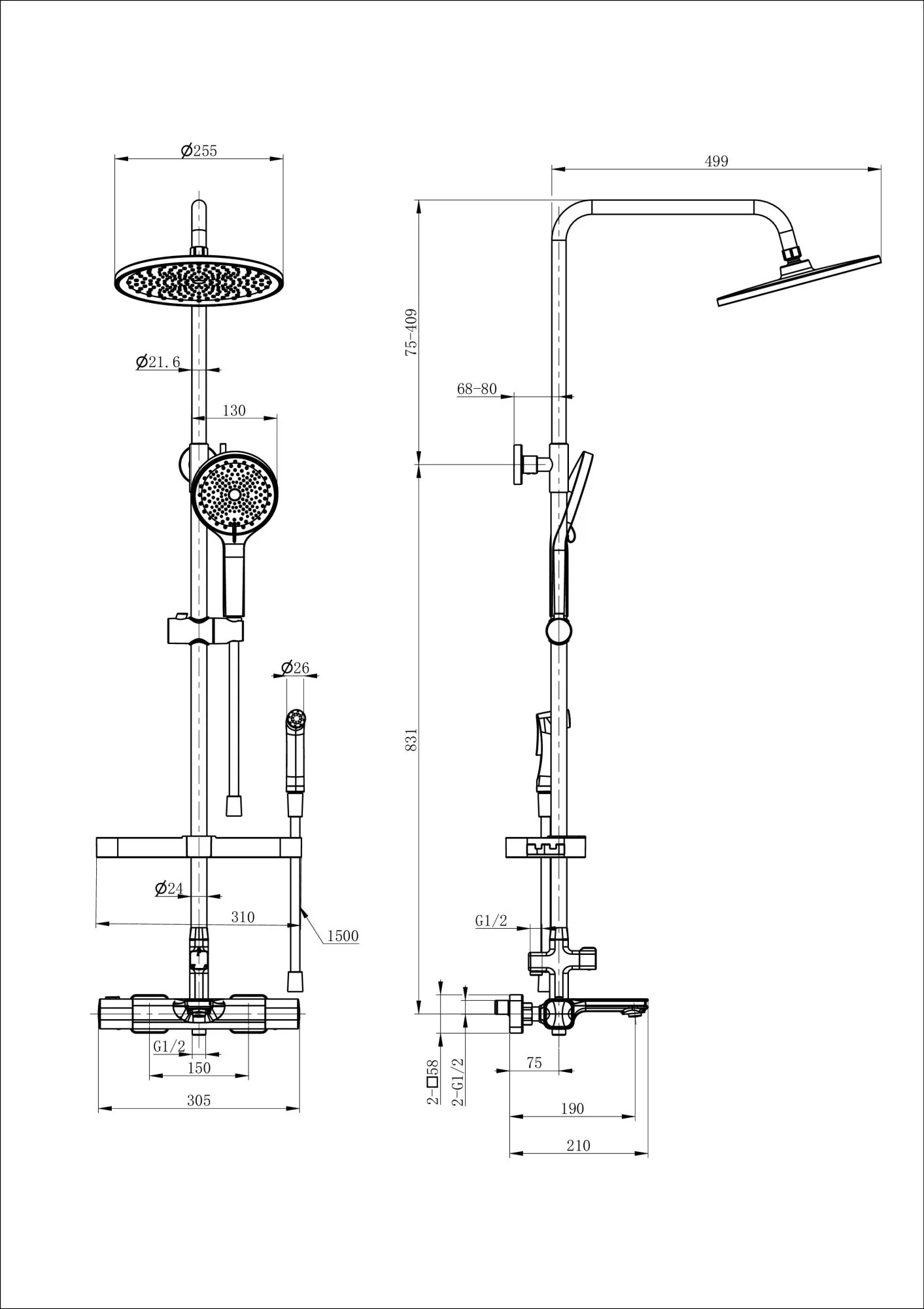 смеситель, душевой шланг - 150 см, душевой шланг - 120 см, держатель для душа, полка, душевая штанга, верхний душ, душевая лейка, лейка гигиенического душа, эксцентрики, монтажный комплект