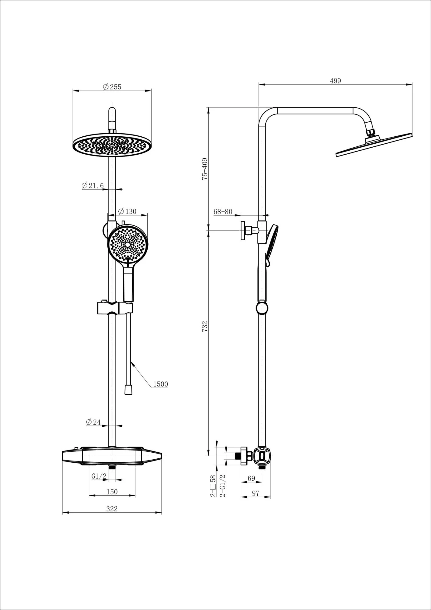 смеситель, душевой шланг/ держатель для душа, душевая штанга, верхний душ, душевая лейка, эксцентрики, монтажный комплект