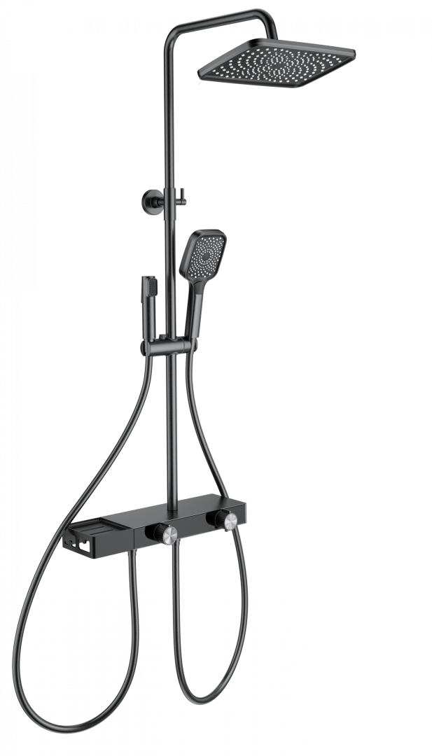 смеситель, душевой шланг 150 см, душевой шланг 120 см, держатель для душа, душевая штанга, верхний душ, душевая лейка, лейка гигиенического душа, полка, эксцентрики, монтажный комплект