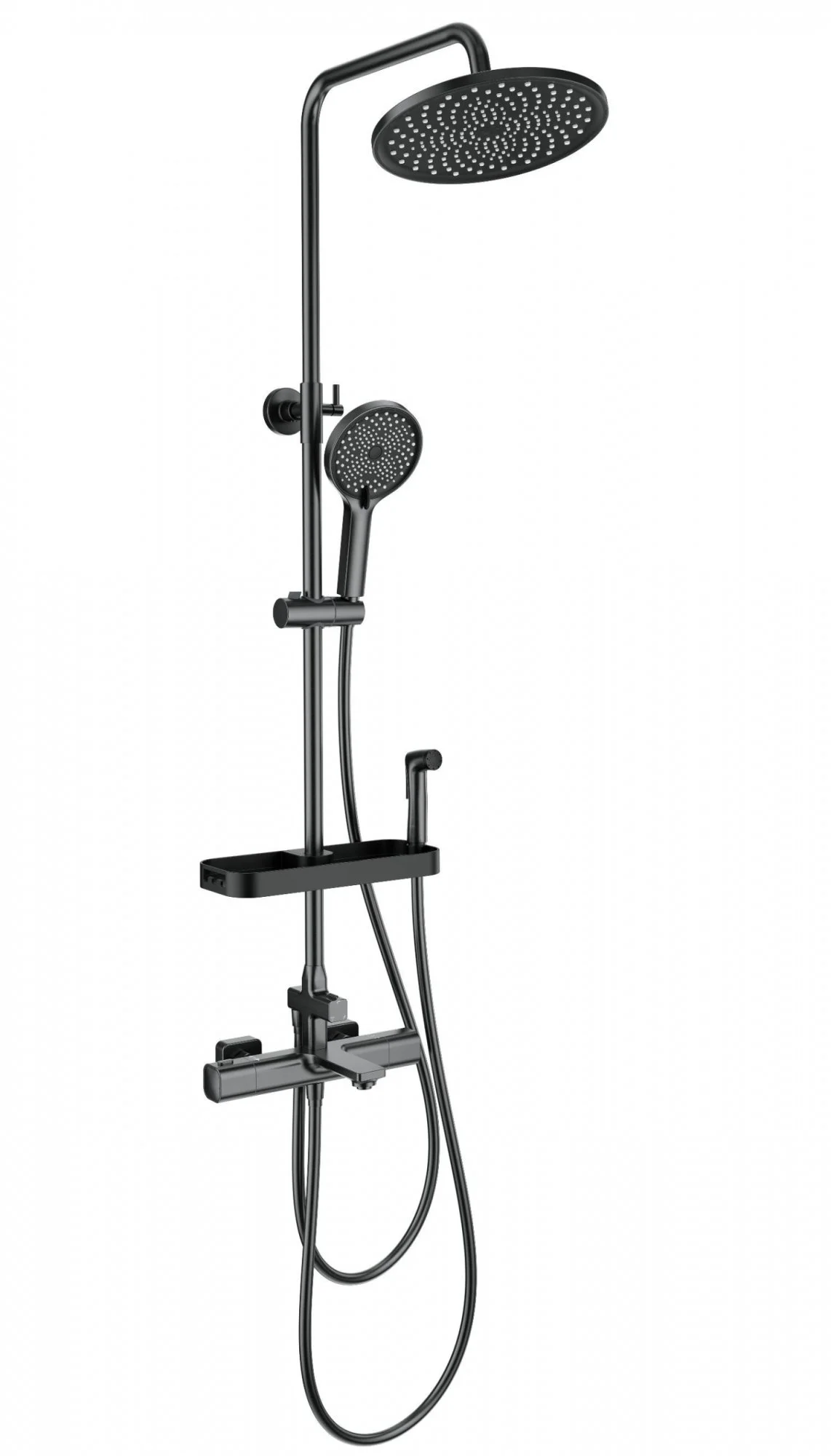 смеситель, душевой шланг - 150 см, душевой шланг - 120 см, держатель для душа, душевая штанга, верхний душ, душевая лейка, лейка гигиенического душа, полка, эксцентрики, монтажный комплект