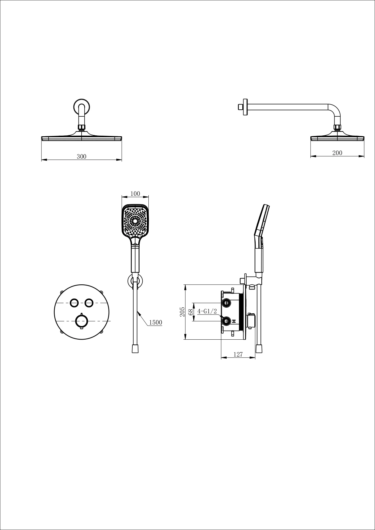 смеситель, душевой шланг/ держатель для душа, душевая штанга, верхний душ, душевая лейка, эксцентрики, монтажный комплект