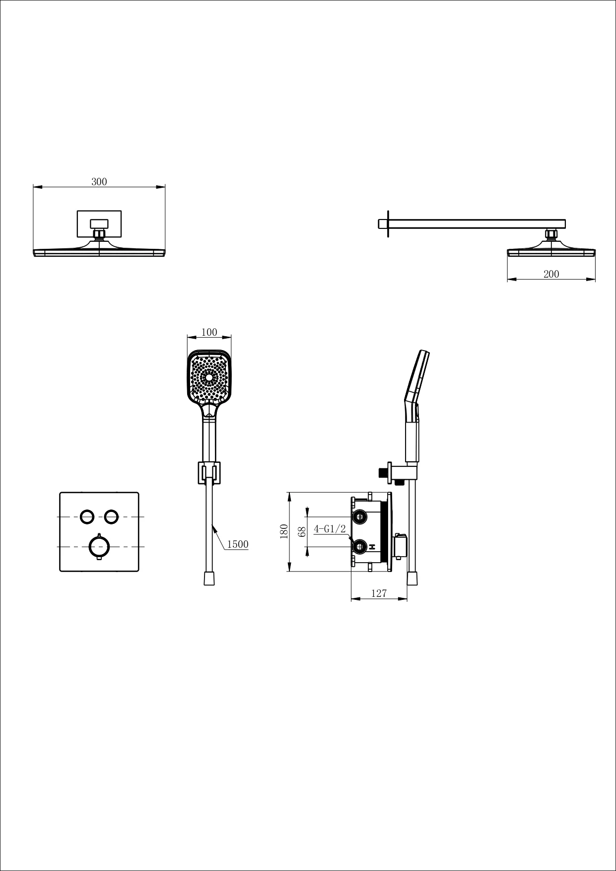 смеситель, душевой шланг/ держатель для душа, душевая штанга, верхний душ, душевая лейка, эксцентрики, монтажный комплект