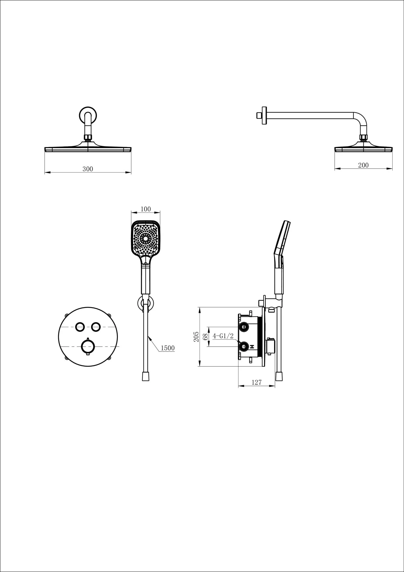 смеситель, душевой шланг/ держатель для душа, душевая штанга, верхний душ, душевая лейка, эксцентрики, монтажный комплект
