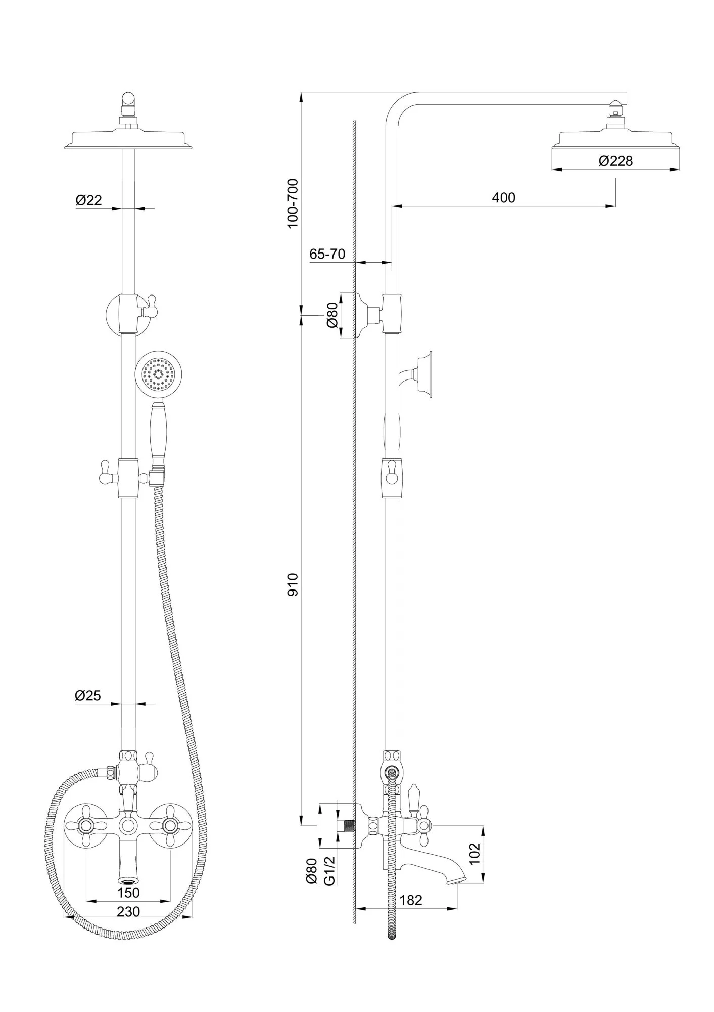 смеситель, душевой шланг/ держатель для душа, душевая штанга, верхний душ, душевая лейка, эксцентрики, монтажный комплект