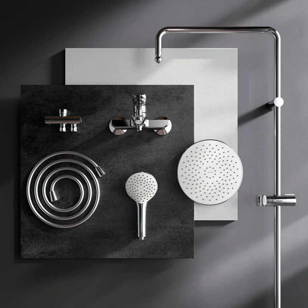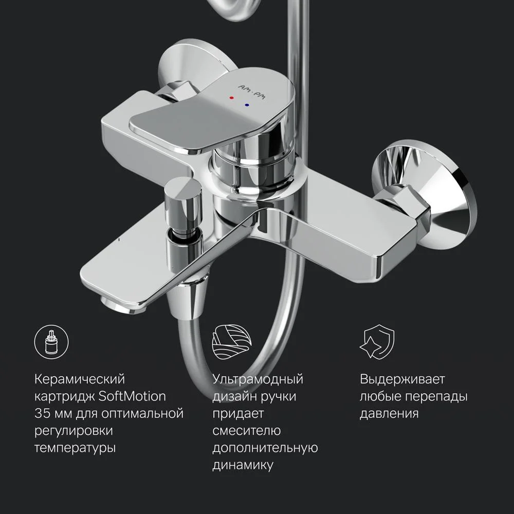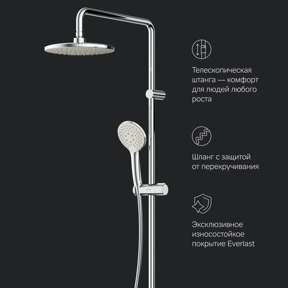 Продуманные детали душевой системы для удобства использования: штанга регулируется по высоте в диапазоне от 1 030 до 1 460 мм обеспечивая комфорт для людей любого роста шаровый шарнир в держателе верхнего душа позволяет регулировать угол его наклона душевой шланг 1750 мм верхний душ диаметром 220 мм ручной душ диаметром 110 мм. ""