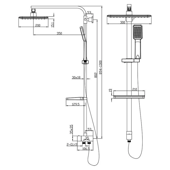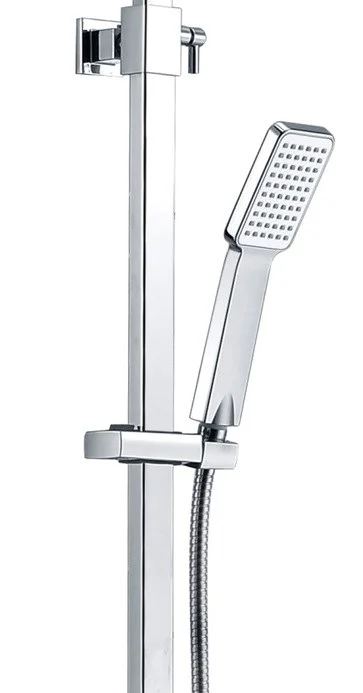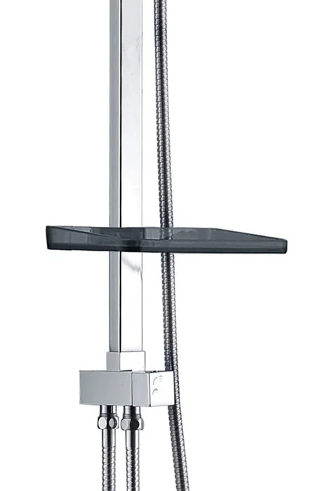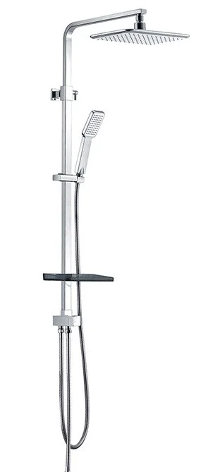 Комплектация: крепления к стене, душевая лейка, душевая штанга, шланг для душа, держатель для душа, верхний душ, полочка.
