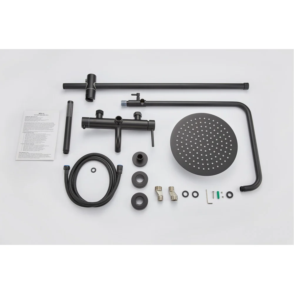 Смеситель - 1 шт., ручная лейка - 1 шт., шланг - 1 шт., верхний душ - 1 шт., штанга с держателем ручной лейки 1 шт., кронштейн для верхнего душа 1 шт, паспорт - 1 шт.