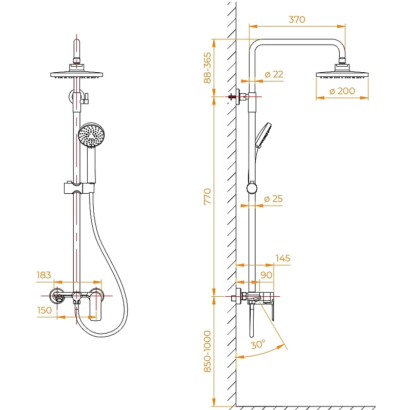 Головной душ из высокопрочного ABS-пластика оснащён шарнирным креплением, что позволяет выбрать необходимый угол направления воды;