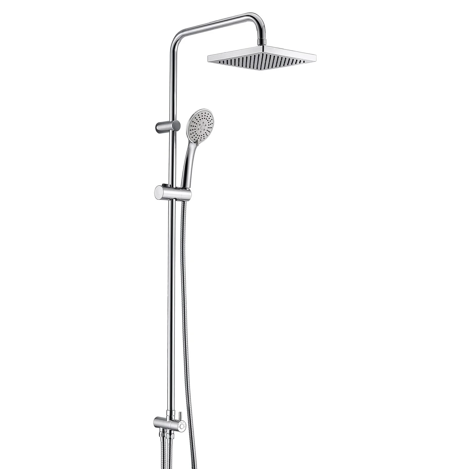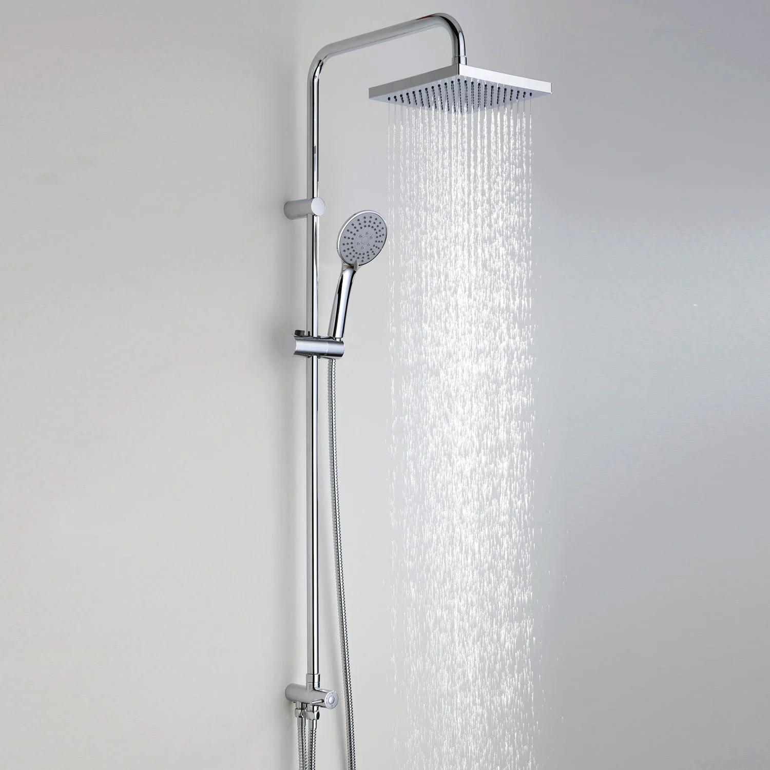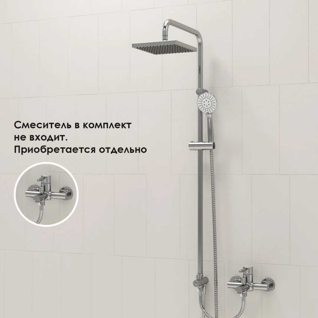 Входит в комплектДушевая насадка 200х200 мм, 144 форсунки, ABS-пластик Стойка для душа, Ø 20мм Лейка 3-функциональная с системой защиты от известковых отложений Шланг металлический 1500 мм, подключение к лейке Шланг металлический 600 мм, подключение к смесителю Керамический поворотный переключатель