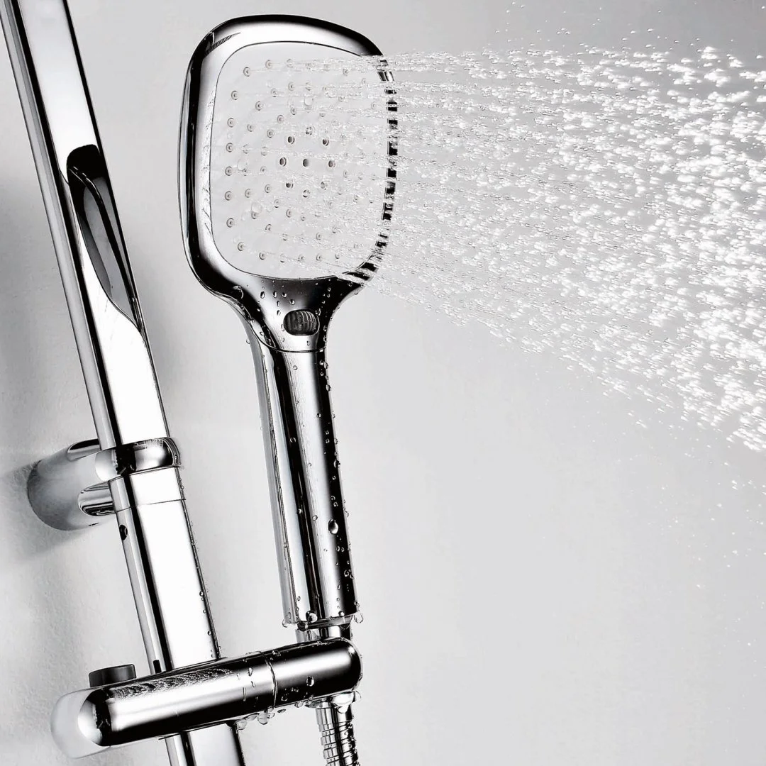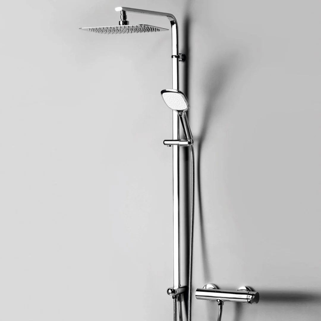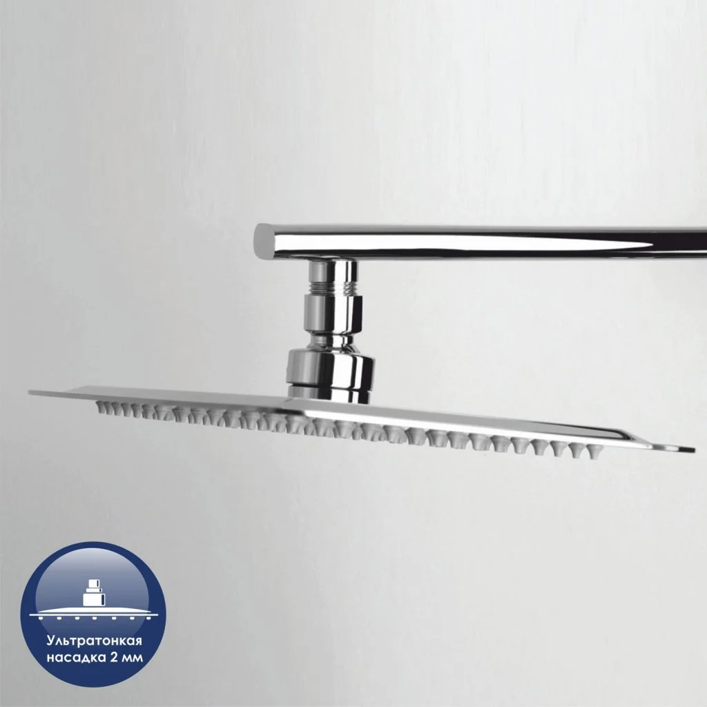 Входит в комплектДушевая насадка 300х200 мм, 112 форсунок, нержавеющая сталь Стойка для душа 30х15 мм Лейка 3-функциональная с системой защиты от известковых отложений Шланг металлический 1500 мм, подключение к лейке Шланг металлический 600 мм, подключение к смесителю Керамический поворотный переключатель