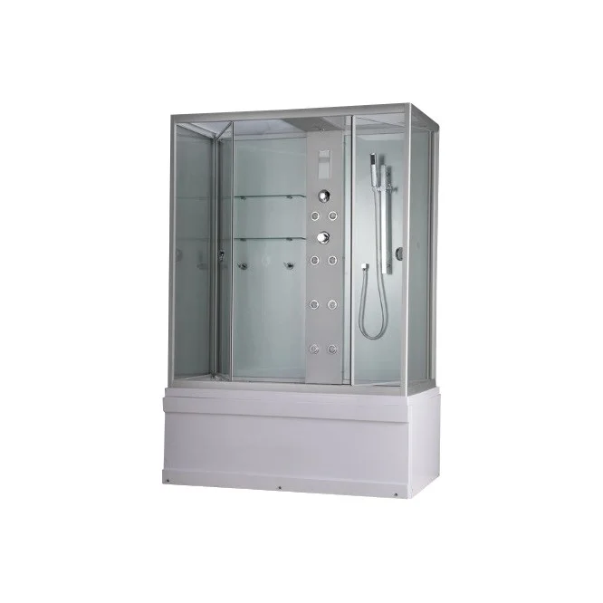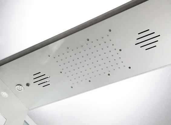 - комплектация: сенсорная панель управления,FM радио,BLUETOOTH; электр. вентиляция; подсветка светодиодная;хромотерапия однорычажный пятирехрежимный смеситель; гидромассаж спины (4+4 джет); верхний душ; ручная лейка на регулируемой по высоте штанге;набор ванны