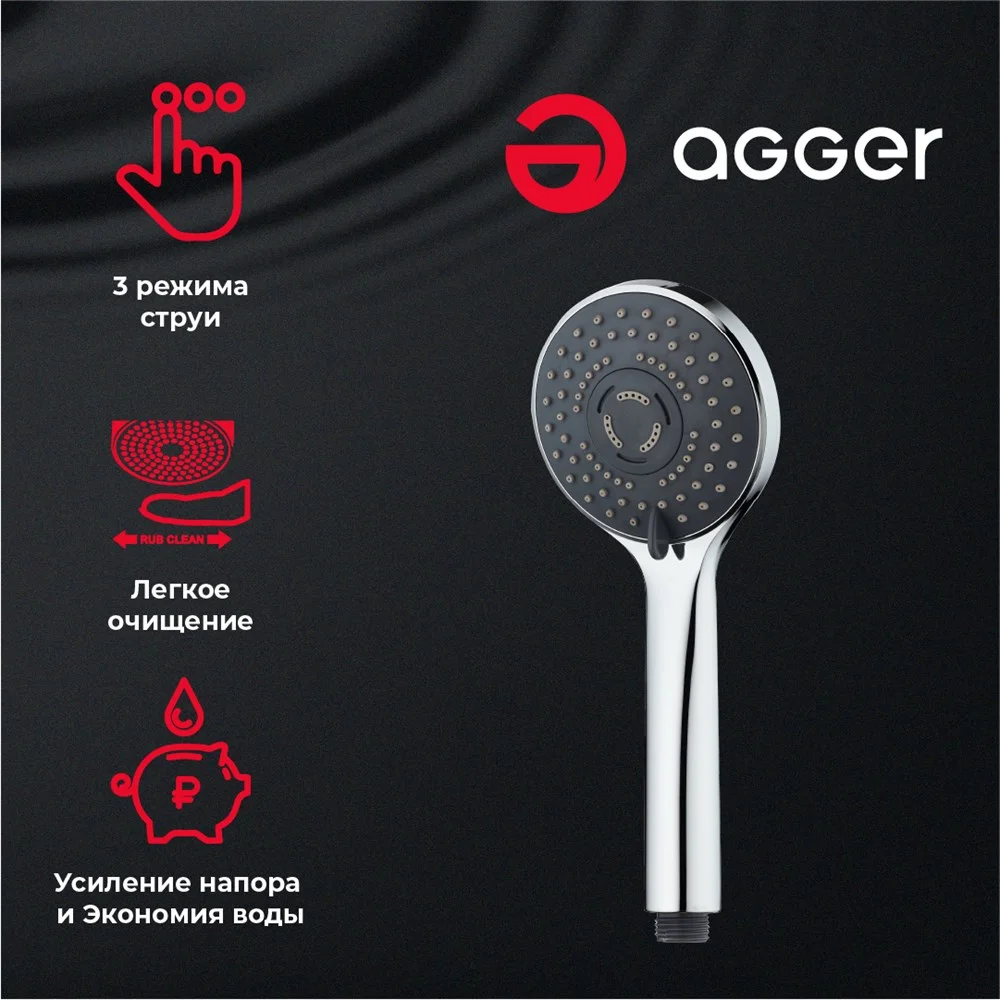 Душевой гарнитур Agger Wave – одно из лучших предложений в своей ценовой категории, сочетающее отличное качество материалов, продуманную эргономику и надежность всех подвижных элементов и крепежных деталей. В душевой комплект входит ручная лейка (9 см, 3 режима) с гибким шлангом (150 см, с защитой от перекручивания), штанга 70 см (с возможностью установки в старые отверстия), держатель лейки с регулировкой угла наклона, пластиковая мыльница. Сантехника произведена в соответствии с передовыми инженерными наработками немецких специалистов, благодаря чему демонстрирует долговечность и отсутствие сложностей в обслуживании.