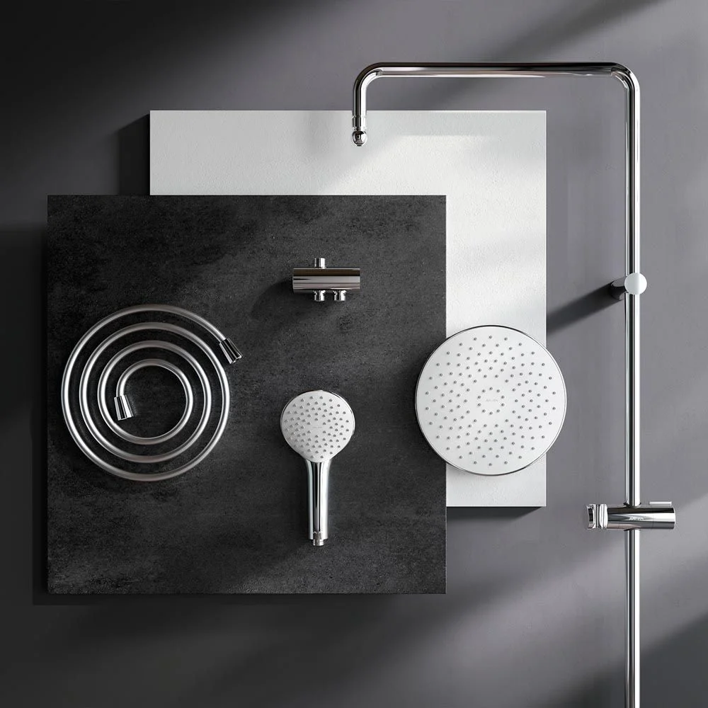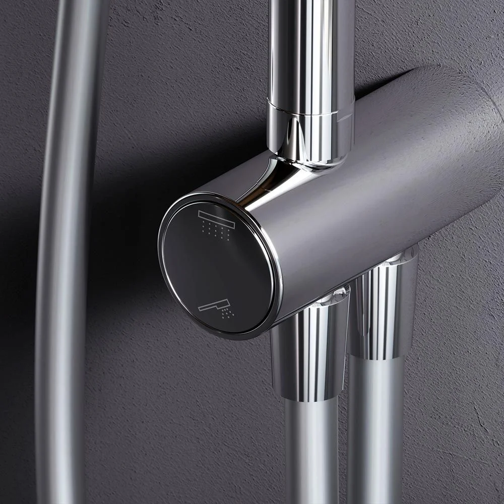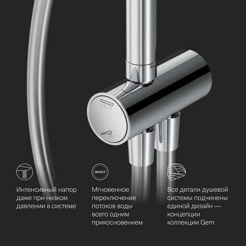 Тотальный дизайн в действии: все детали душевой системы – от пропорций ручного и верхнего душей до рисунка расположения форсунок на лейках – подчинены единой дизайн-концепции коллекции Gem.