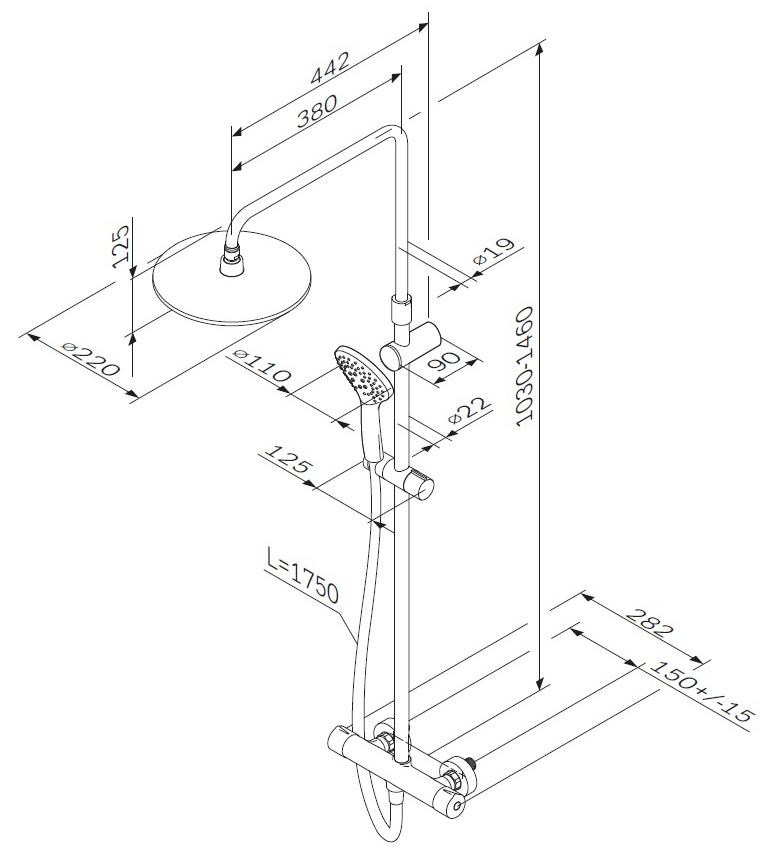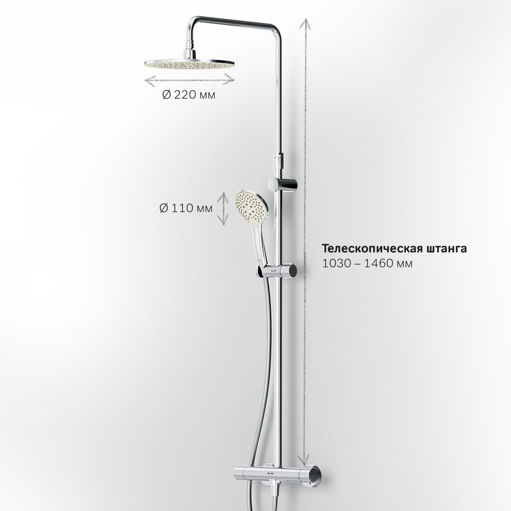 Продуманные детали для удобства использования: штанга регулируется по высоте в диапазоне от 1 030 до 1 460 мм обеспечивая комфорт для людей любого роста шаровый шарнир в держателе верхнего душа позволяет регулировать угол его наклона душевой шланг 1750 мм верхний душ диаметром 220 мм ручной душ диаметром 110 мм.