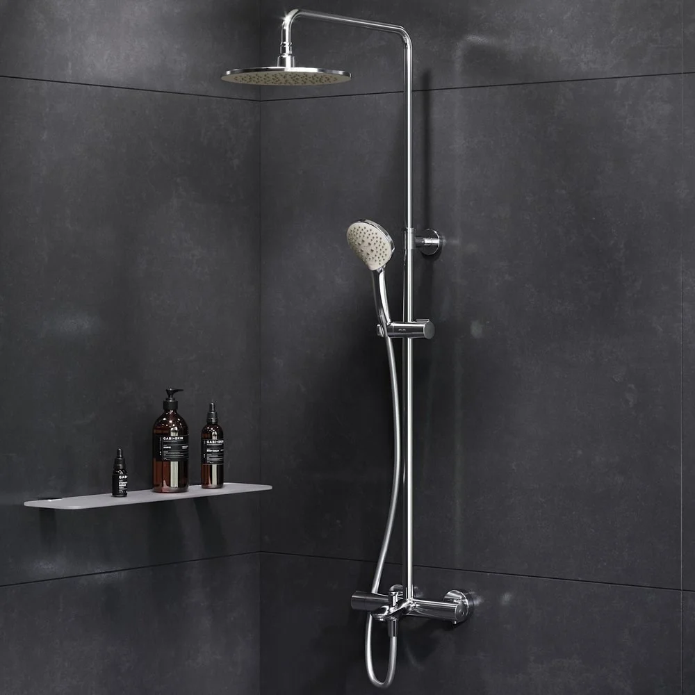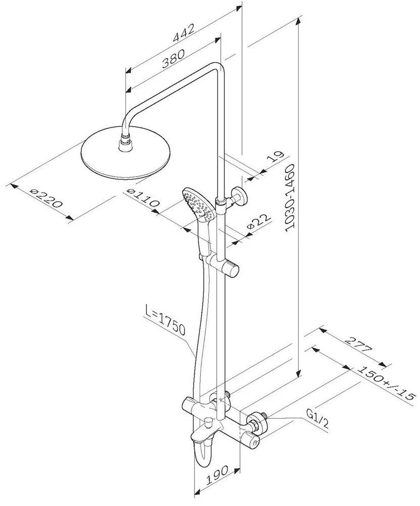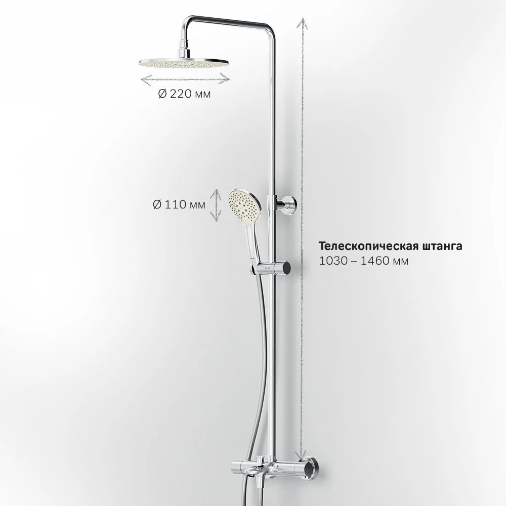 Продуманные детали для удобства использования: штанга регулируется по высоте в диапазоне от 880 до 1270 мм обеспечивая комфорт для людей любого роста шаровый шарнир в держателе верхнего душа позволяет регулировать угол его наклона душевой шланг 1750 мм верхний душ диаметром 220 мм ручной душ диаметром 110 мм.