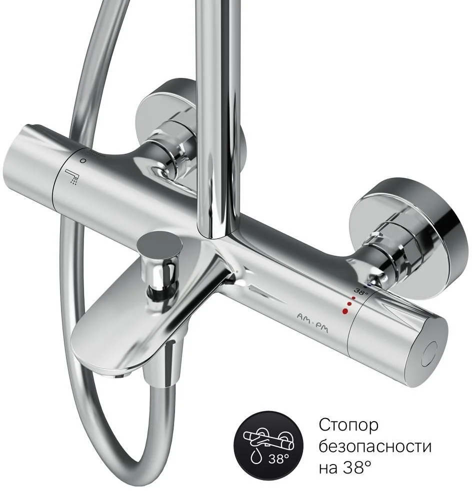 Смеситель для ванны и душа с термостатом: термостатический картридж с высокочувствительным термоэлементом стопором безопасности на 38 градусов быстрой реакцией на изменения температуры или давления надежно защищает от ожога даже при внезапном отключении холодной воды.
