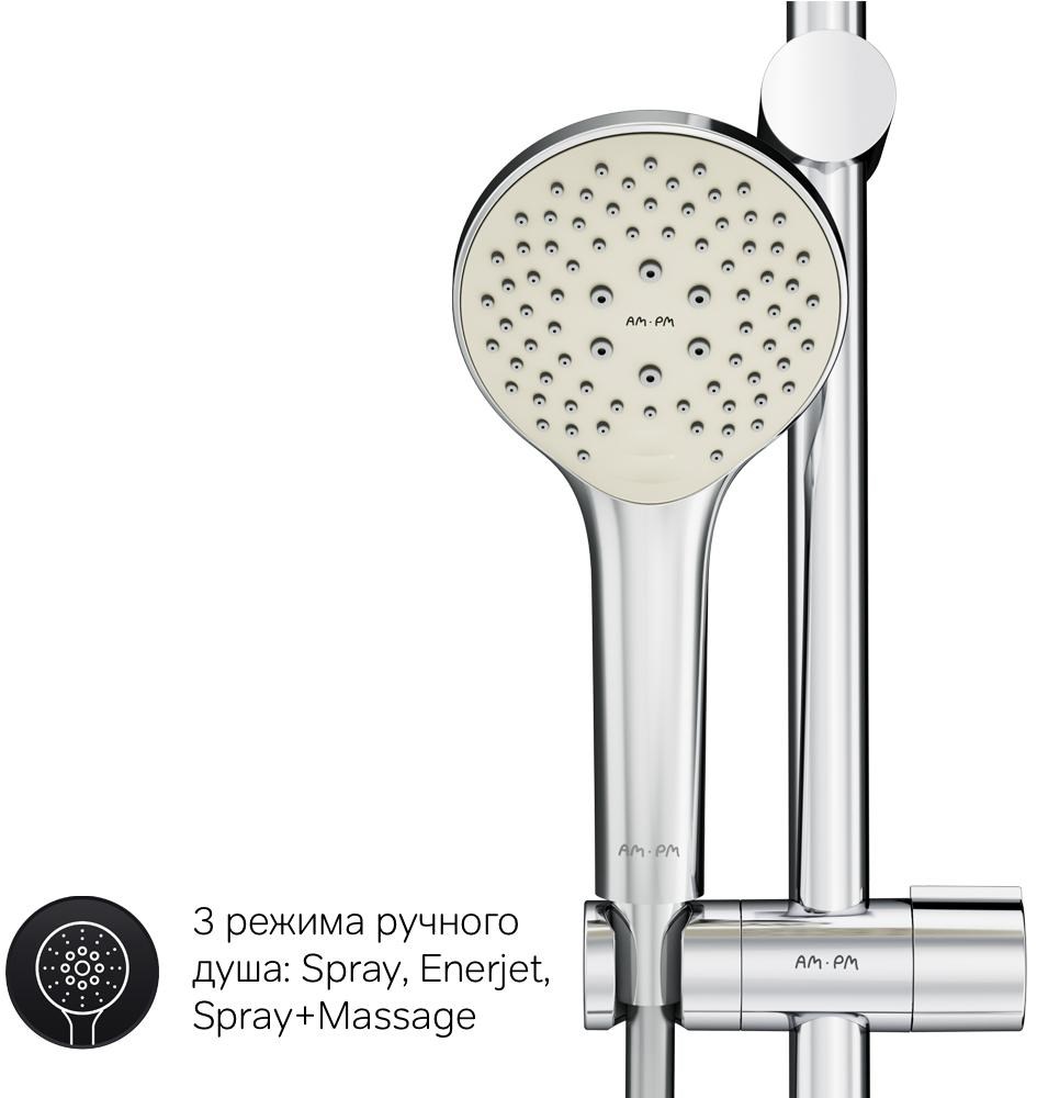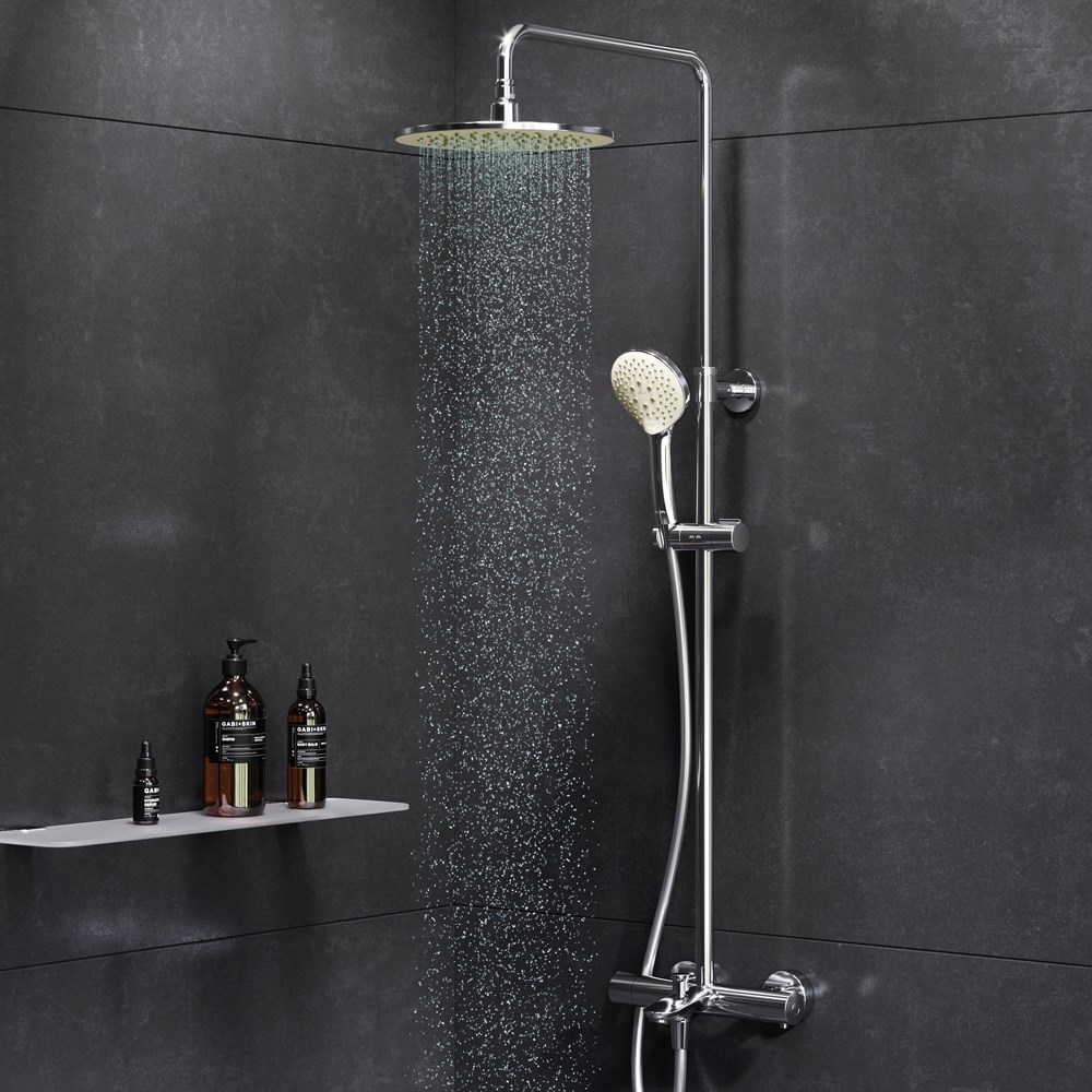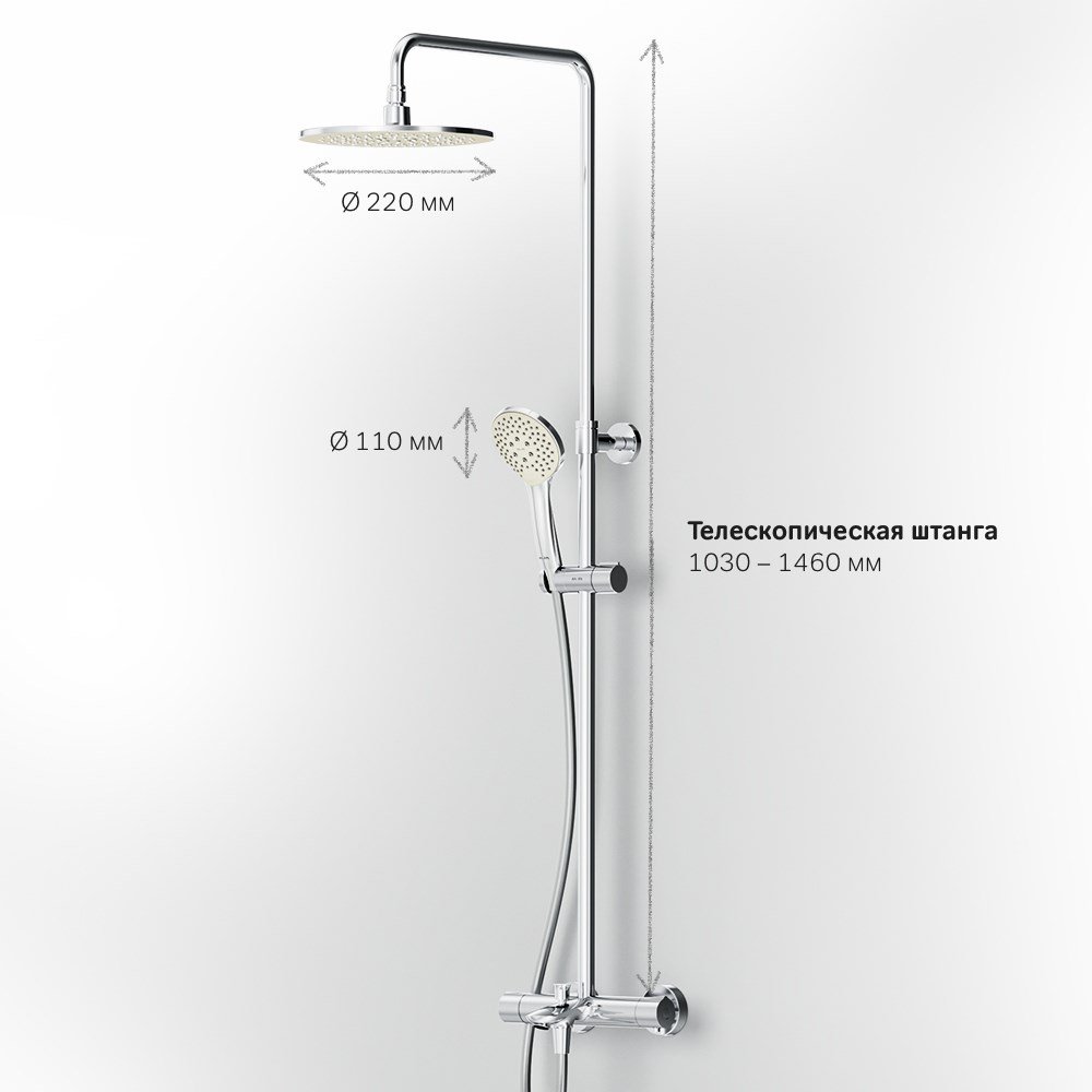 Продуманные детали для удобства использования: штанга регулируется по высоте в диапазоне от 880 до 1270 мм обеспечивая комфорт для людей любого роста шаровый шарнир в держателе верхнего душа позволяет регулировать угол его наклона душевой шланг 1750 мм верхний душ диаметром 220 мм ручной душ диаметром 110 мм.