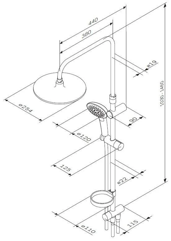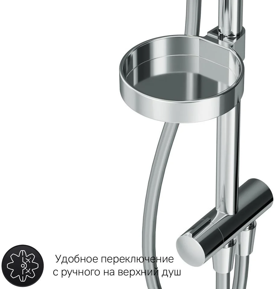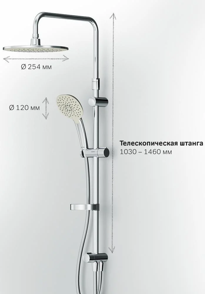 Продуманные детали для удобства использования: штанга регулируется по высоте в диапазоне от 1 030 до 1 460 мм обеспечивая комфорт для людей любого роста шаровый шарнир в держателе верхнего душа позволяет регулировать угол его наклона душевой шланг 1750 мм верхний душ диаметром 254 мм ручной душ диаметром 120 мм.