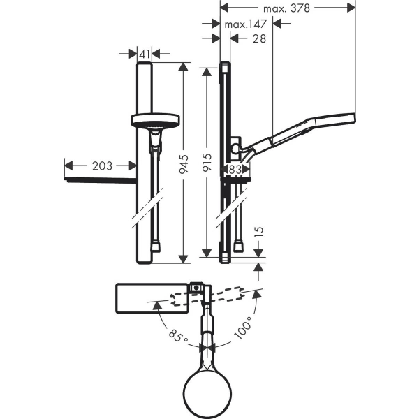 - держатель ручного душа регулируется в пределах 90°, поворачивается вправо и влево, перемещается вверх и вниз