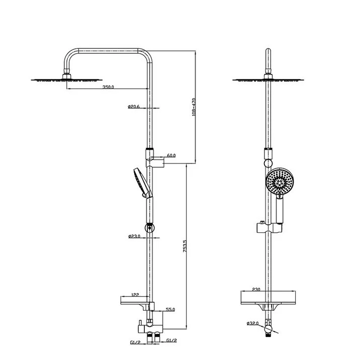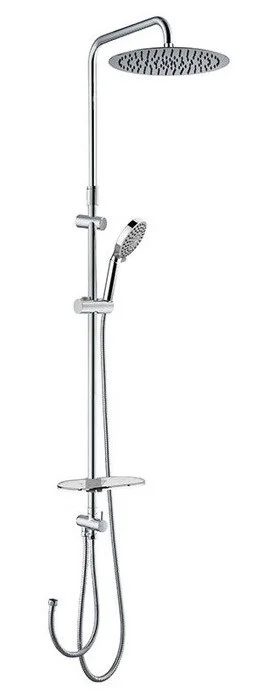Верхний душ: да; Количество режимов лейки: 5; Комплектация: вместительная полка из высокопрочного ABS-пластика ; Штанга: сталь; Верхний душ: верхняя, сверхтонкая, 300 мм; Лейка для душа: ABS-пластик; Гибкий шланг: нержавеющая сталь, 1,5 м; системы Double Lock и Twist-Free; гибкий шланг 0,6 м соединяет со смесителем; Поворотный керамический дивертор: три режима (переключалель верхний душ/ручная лейка/комбо-режим); Общие характеристики: Свободное крепление, возможность индивидуального выбора точек крепления стойки. Телескопическая стойка, увеличивающая длинну стойки до 30 см. Шарнирное крепление верхнего душа регулирует направление потока под нужным углом.