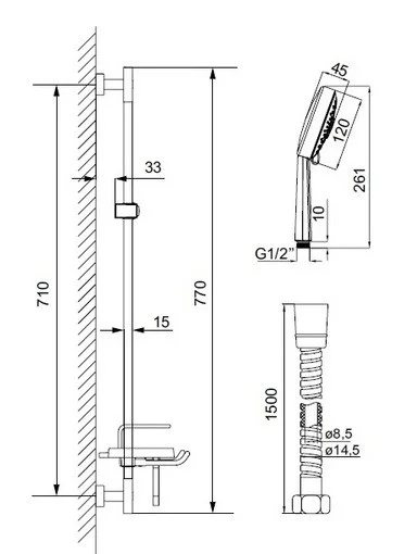 Оснащение: душевая лейка, душевая штанга, мыльница, шланг для душа, держатель для душа.