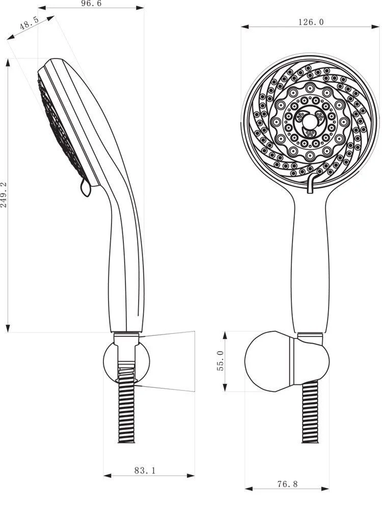 • 7-функциональная лейка Ø125 мм. Режимы: распыление, брызги шампанского, массаж, туман, распыление и массаж, распыление и туман, пауза