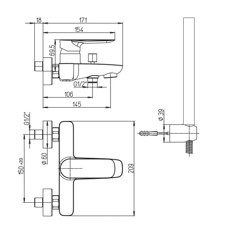 Комплект состоит из штанги высотой 90 см, выполненной из не требовательной в уходе нержавеющей стали; гибкого шланга из ПВХ длиной 150 см и лейки из прочного современного материала - пластика ABS.