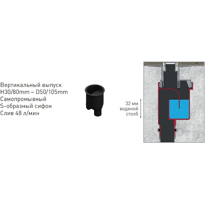 вертикальный выпуск D50/105 H50, пропускная способность 42л/мин, монтаж 360°