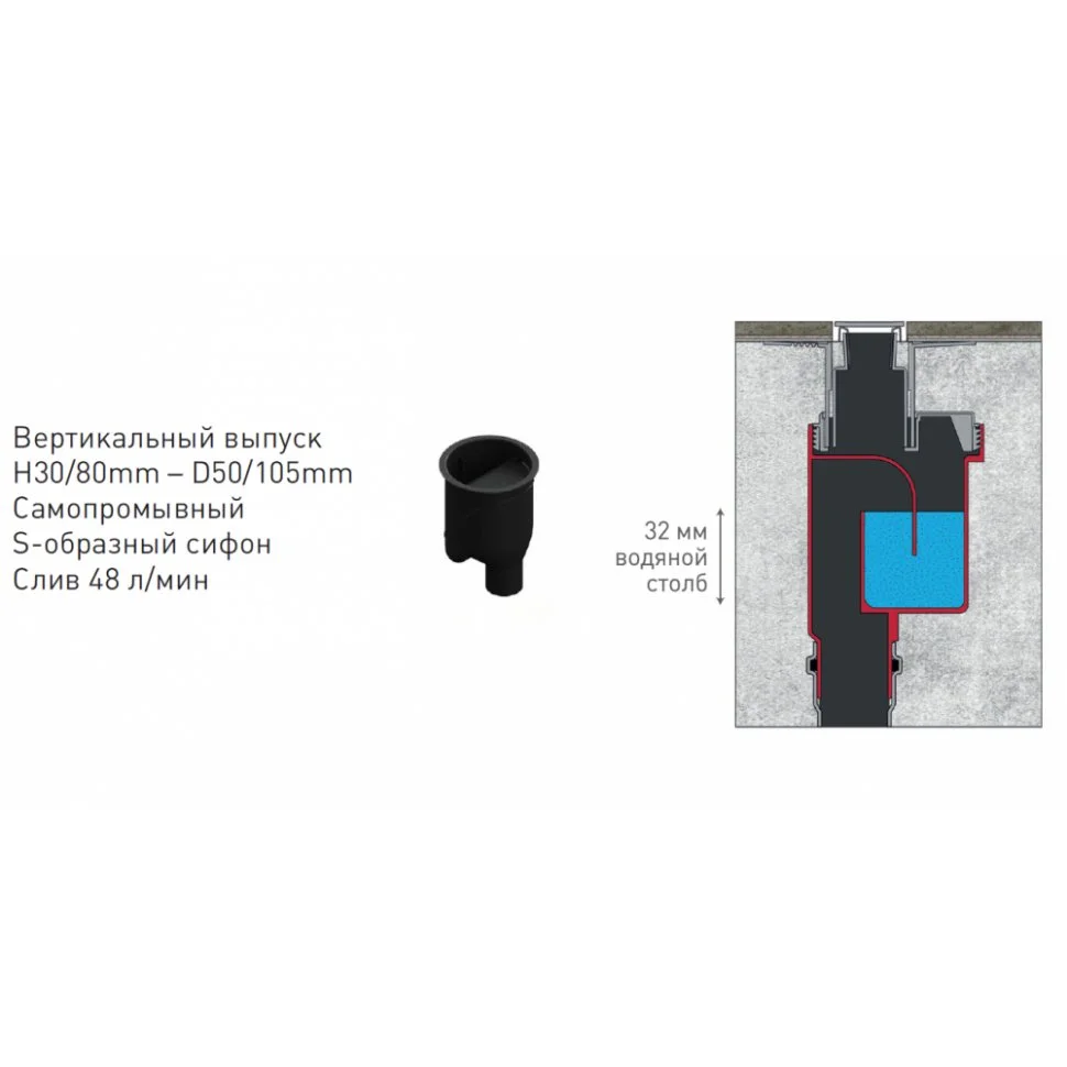 вертикальный выпуск D50/105 H50, пропускная способность 42л/мин, монтаж 360°