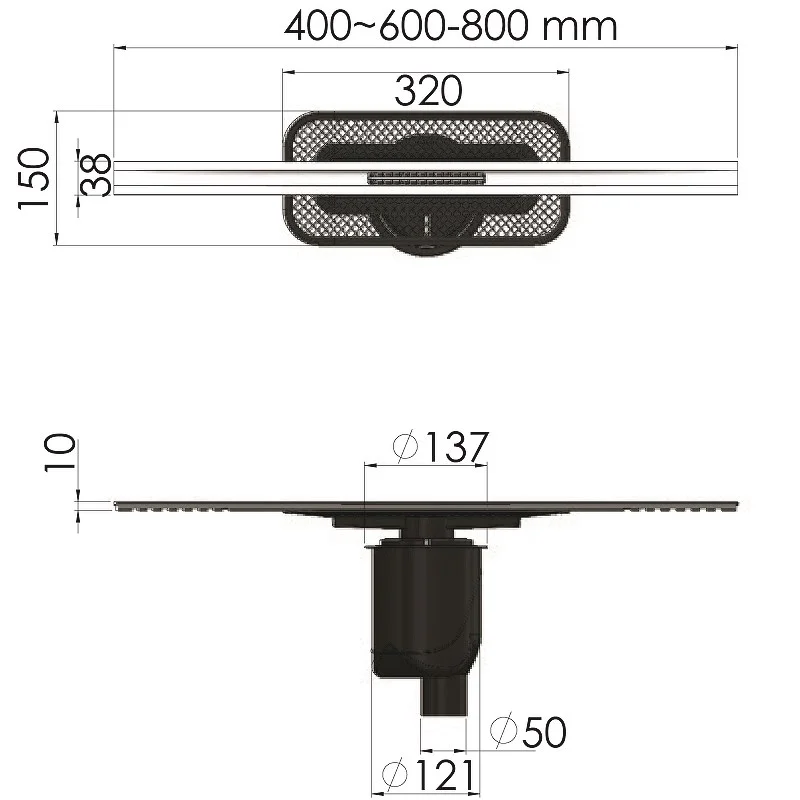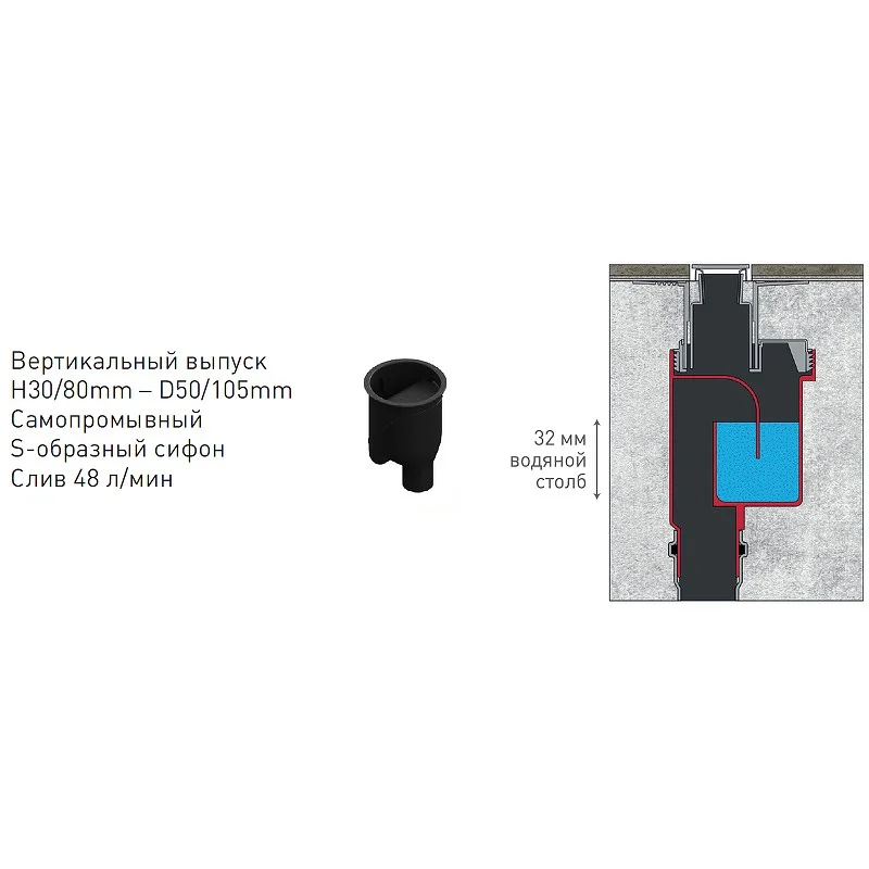 вертикальный выпуск D50/105 H50, пропускная способность 42л/мин, монтаж 360°