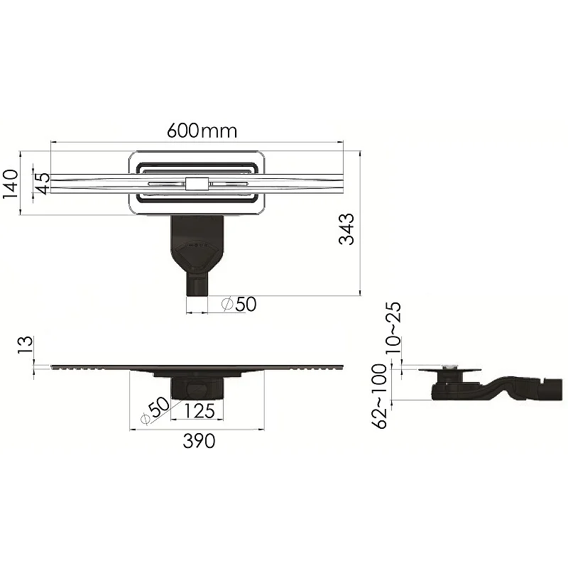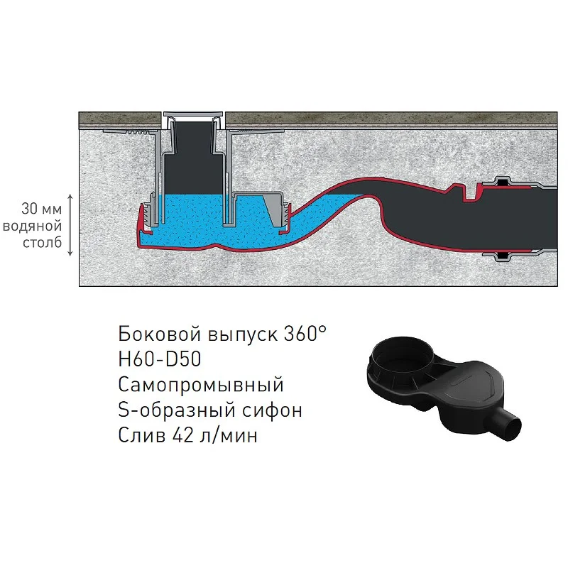 горизонтальный выпуск D50 H60, пропускная способность 42л/мин, монтаж 360°