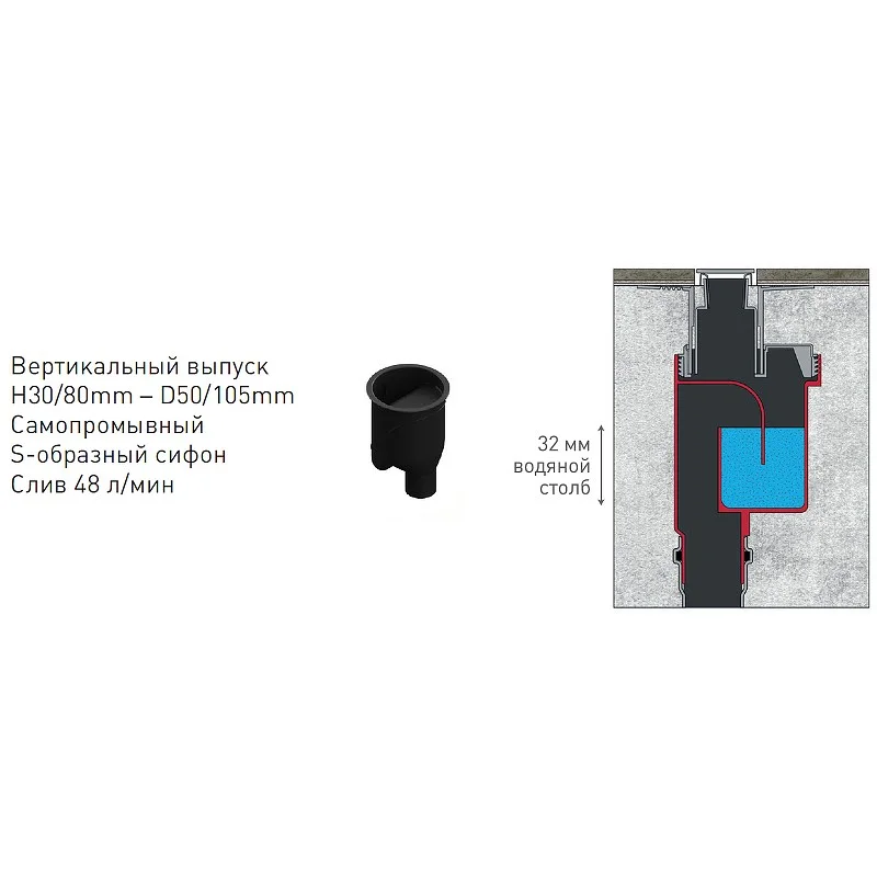 вертикальный выпуск D50/105 H50, пропускная способность 42л/мин, монтаж 360°
