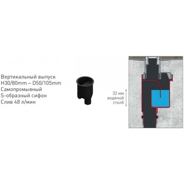 вертикальный выпуск D50/105 H50, пропускная способность 42л/мин, монтаж 360°
