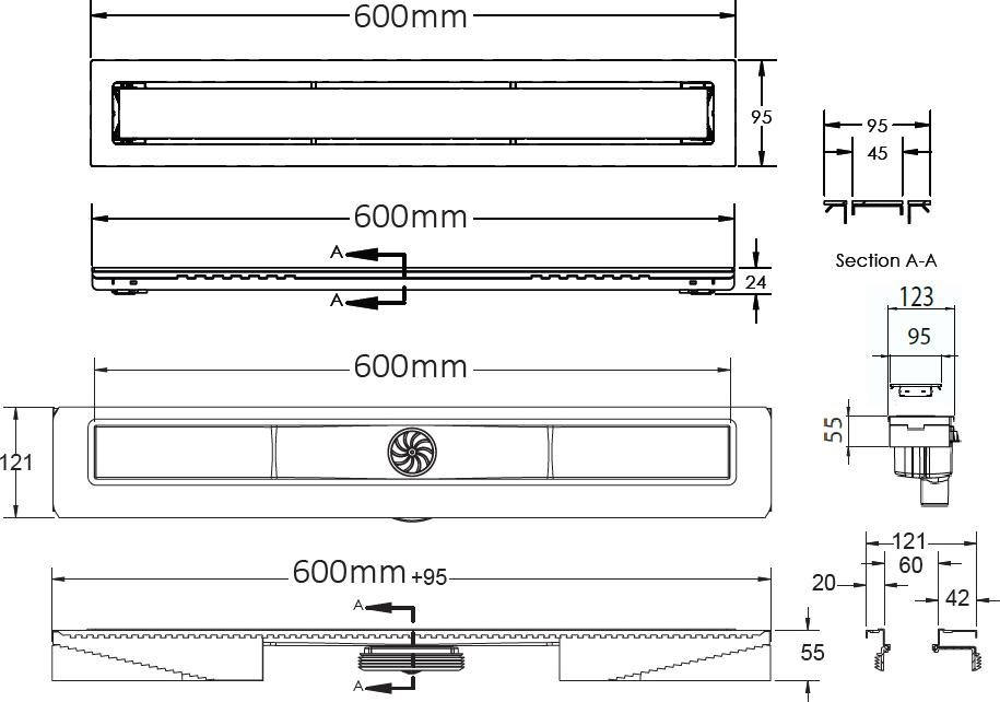 Душевой лоток BERGES TOP Stark 600, хром глянец, S-сифон D50/105 H50 вертикальный