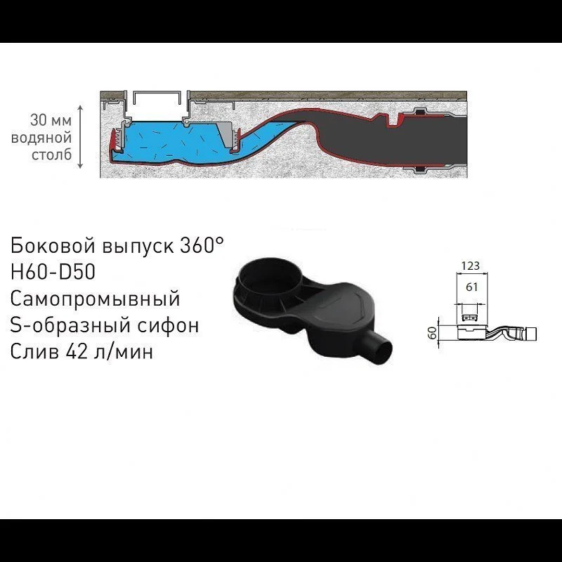 горизонтальный выпуск D50 H60, пропускная способность 42л/мин, монтаж 360°