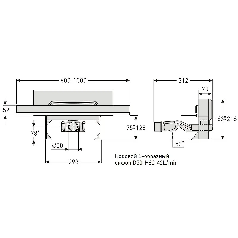горизонтальный выпуск D50 H60, пропускная способность 42л/мин, монтаж 360°